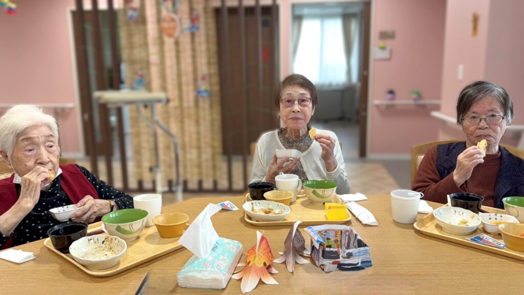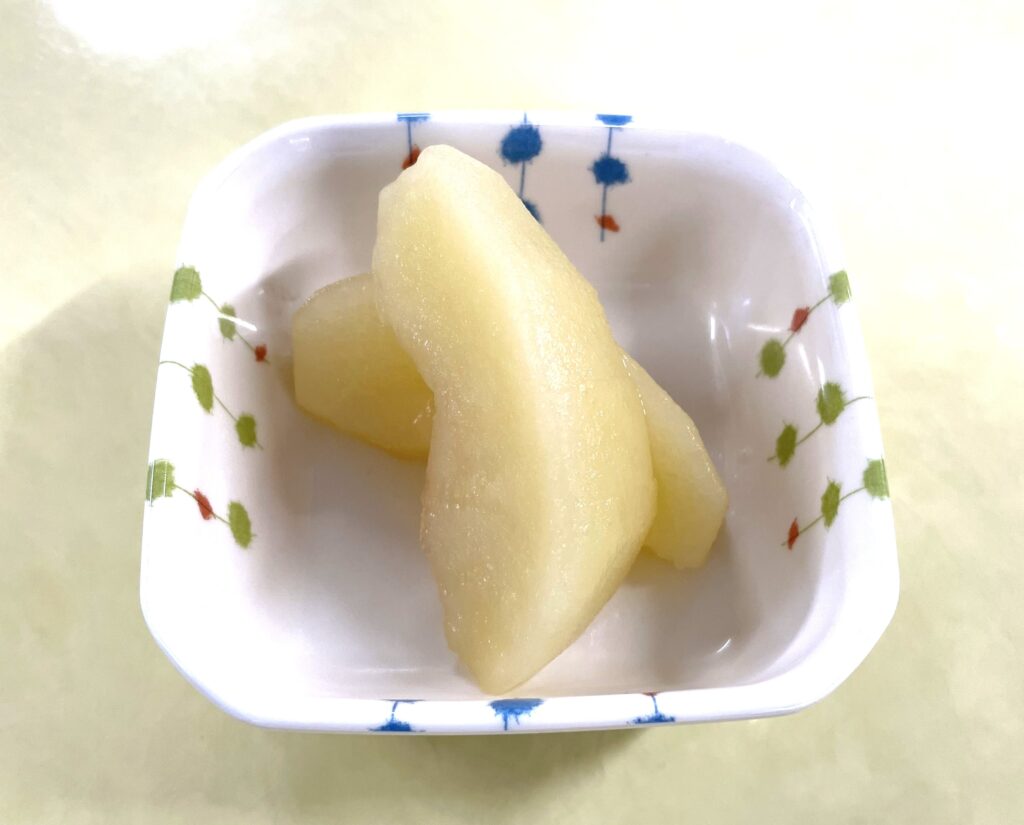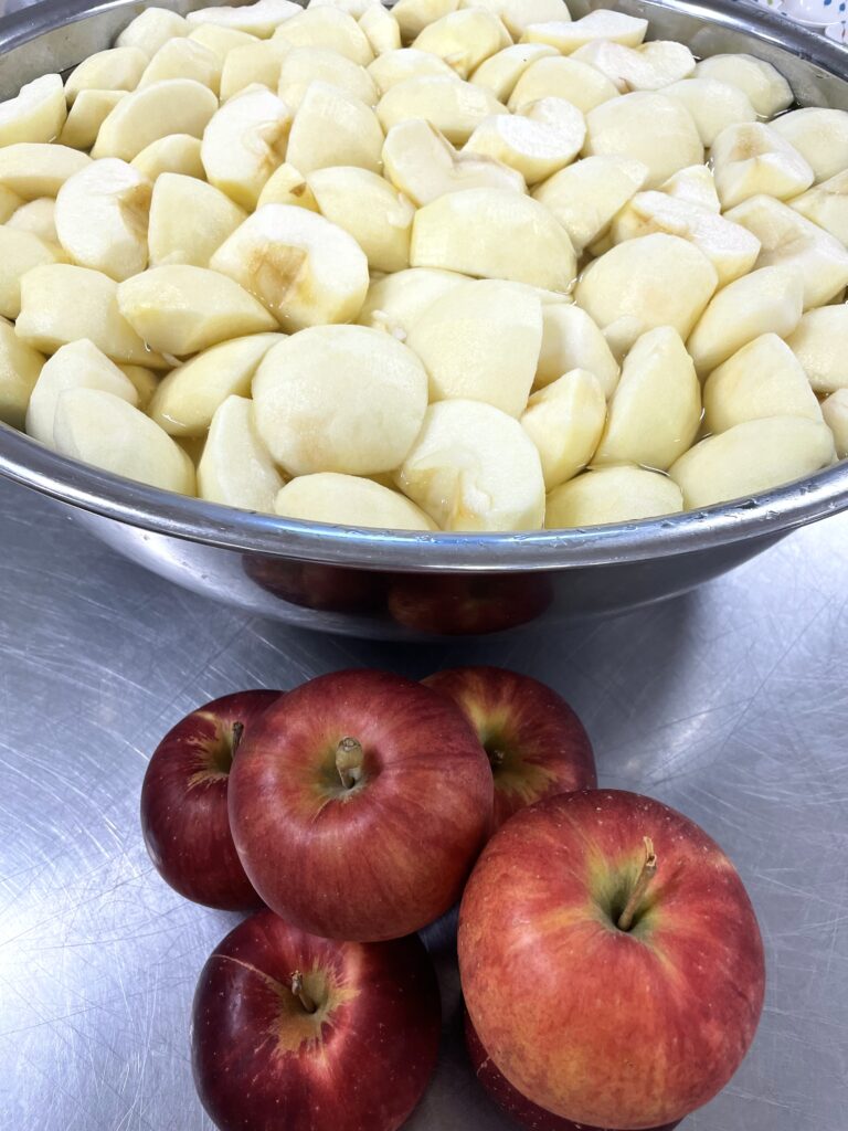 今日の昼食のデザートは、壮瞥・阿野観光果樹園さんの早生ふじりんごを提供しました。昨年から、りんごが旬になる時期には、つがる・早生ふじ・シナノスイート・トキなど様々な品種のりんごを提供していますが、品種により味わいや食感は様々です。入所者様も『今日のは甘いね』『蜜が入っていてジューシーだね』などお隣の席の方と会話を楽しみながら召し上がっています。生のりんごは固くて食べられない方には、コンポートを作って提供していますが、こちらも生のりんごとは違う美味しさで好評です。