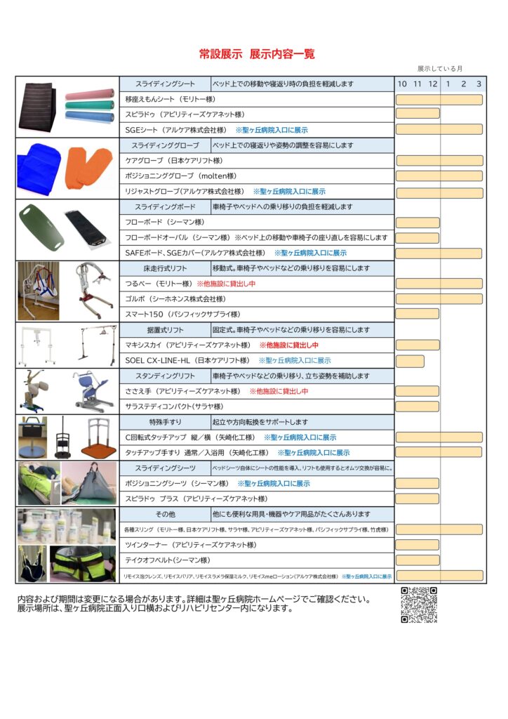 ※現在、他施設様の試用により「移動式リフト つるべー」「スタンディングリフト ささえ手」「据置式リフトマキシスカイ」は当院展示にはありませんのでご注意ください。