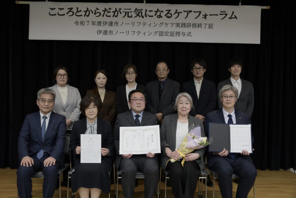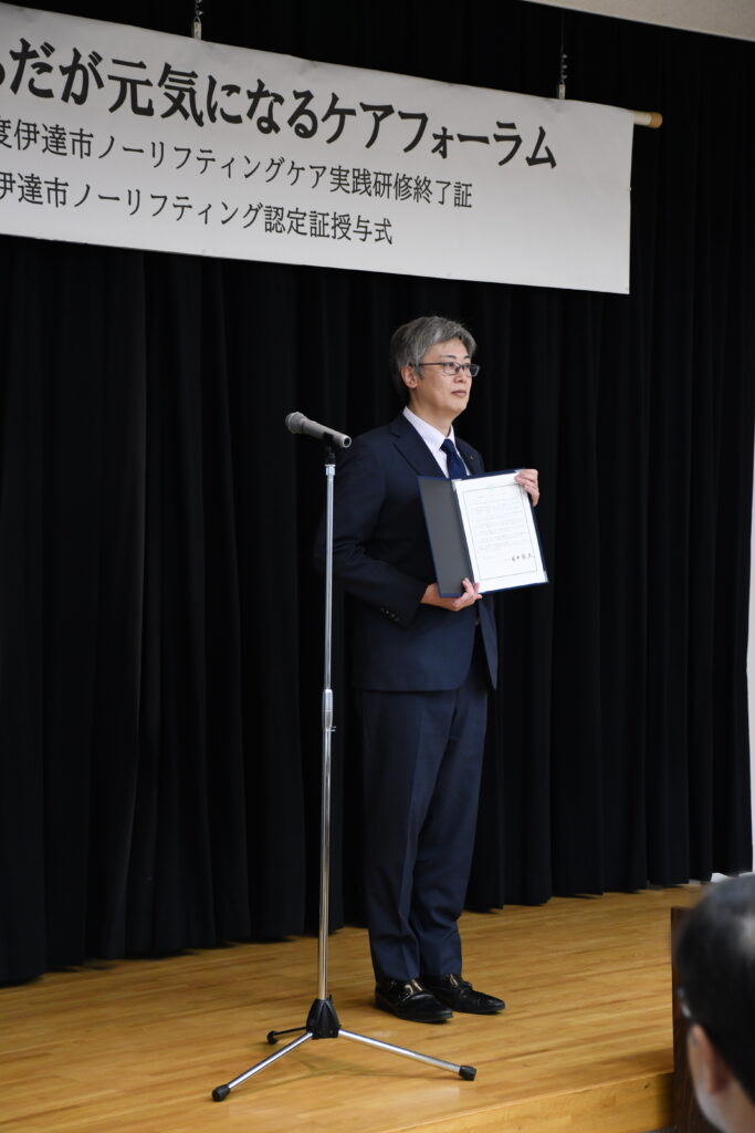 当日は堀井市長より、取り組みを称える表彰状が授与され、目良院長が代表して受け取りました。また、市長から「伊達市ノーリフティング宣言」が発表され、道内で初めての取り組みとして、市を挙げて普及・推進していくことが宣言されました。