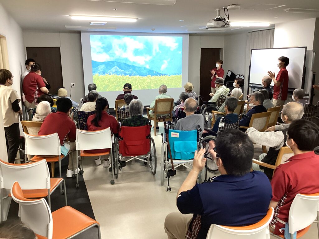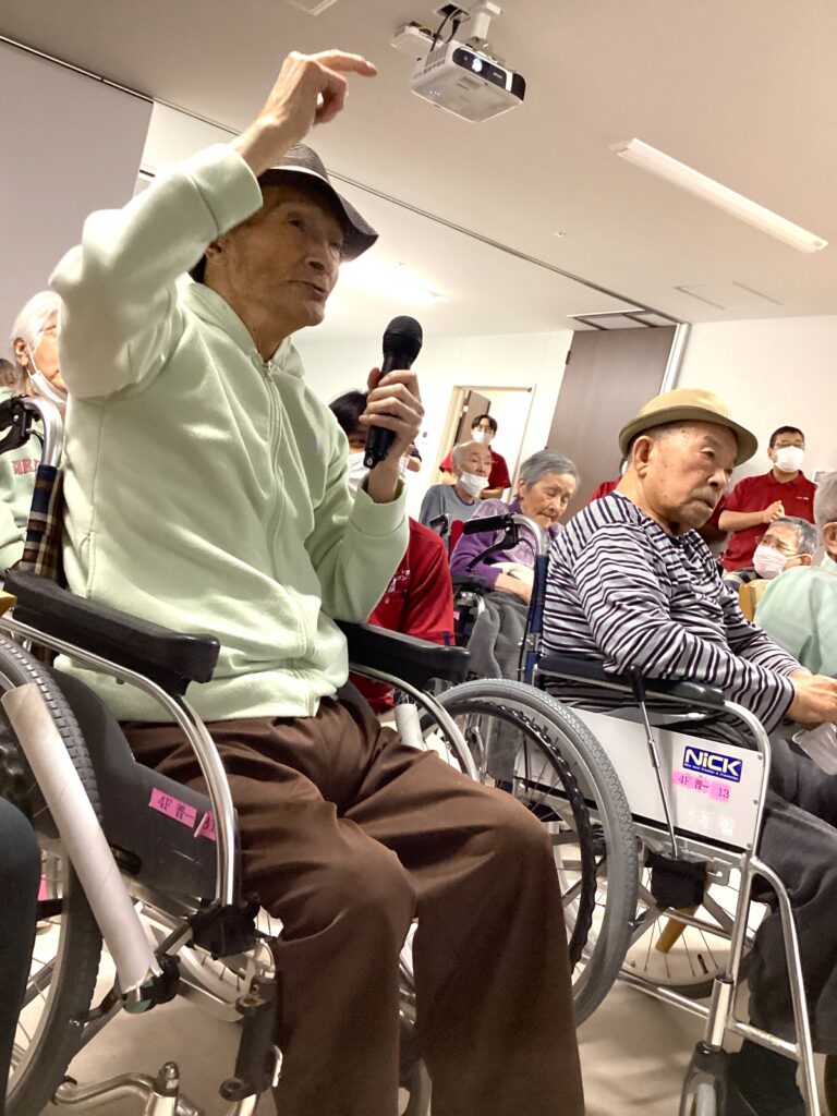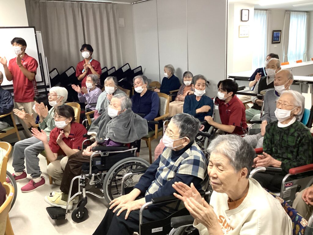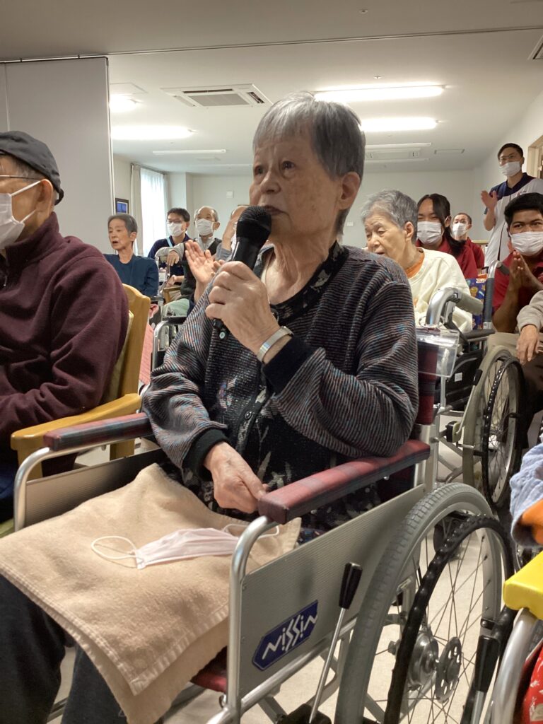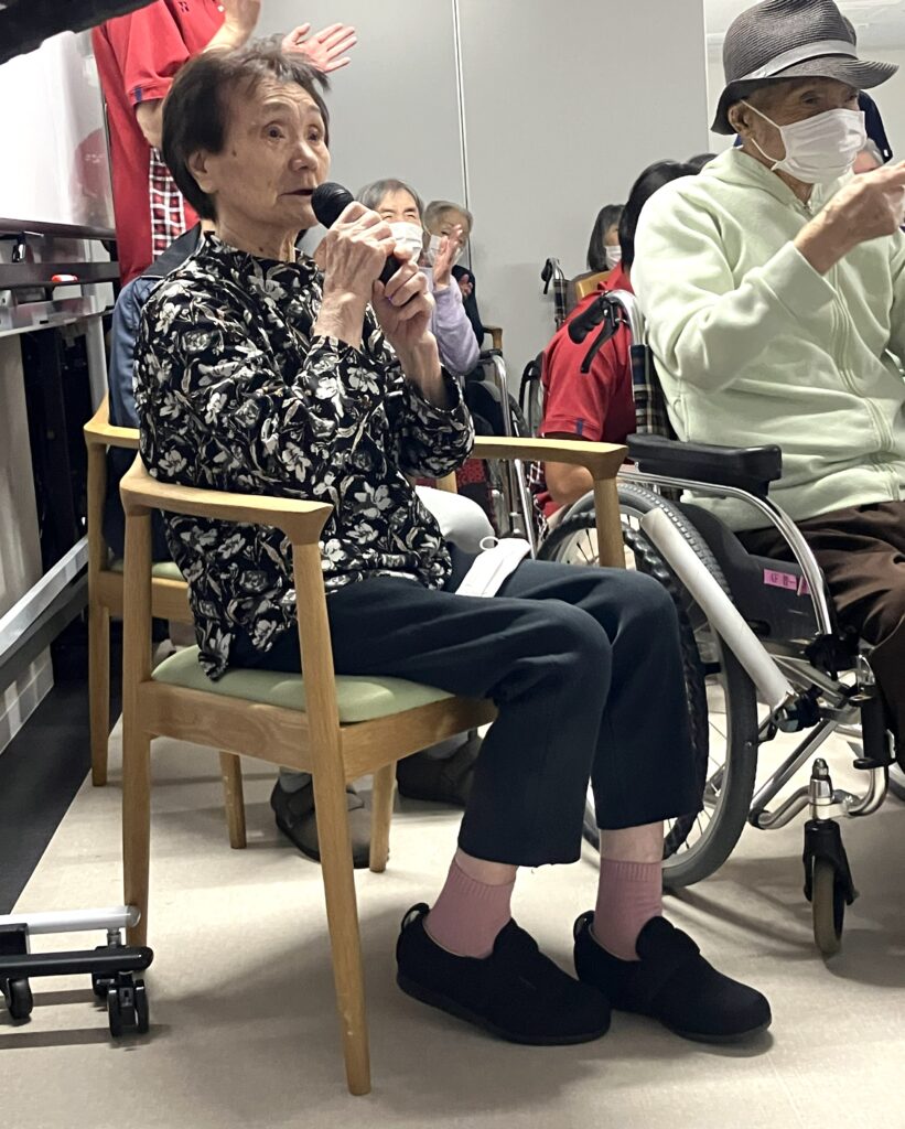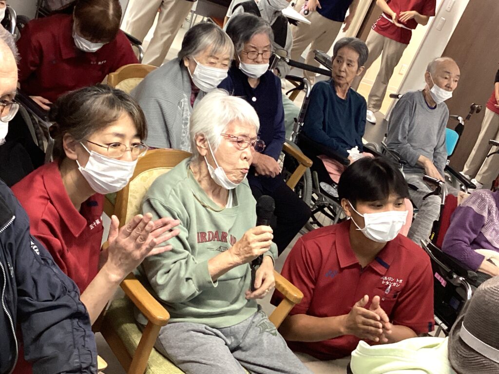 11月19日に利用者様のカラオケ会を行いました。今回は各階から24名の方が参加し、10名の方に往年の名曲を歌っていただきました。