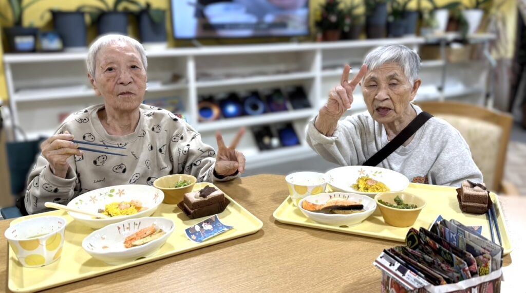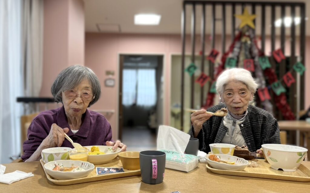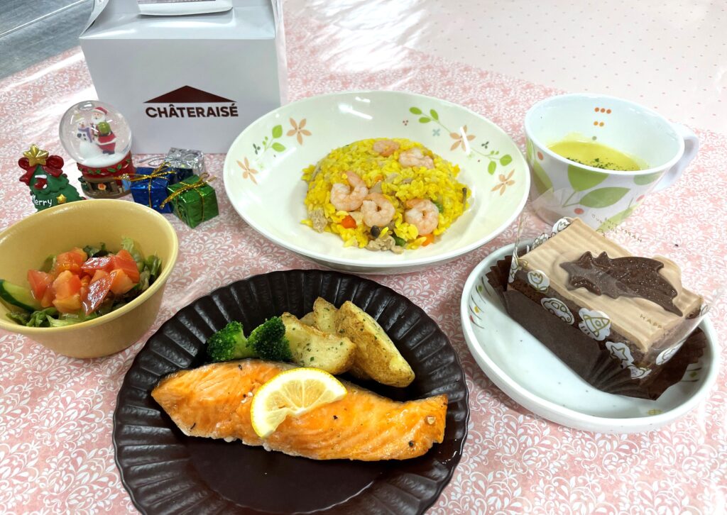 今日は施設のクリスマス会でした。昼食のメニューは『サフランライス・コーンスープ・サーモンのハーブソテー・フライドポテト・グリーンサラダ・チョコレートケーキ』でした。サフランライスは初挑戦のメニューでしたが、黄色も鮮やかに具沢山で美味しく出来ました。普段の献立で鶏肉を提供する機会が多いため、今年のメイン料理はサーモンのハーブソテーを提供しました。サーモンは脂が乗って柔らかく、食欲をそそるハーブの香りも好評でした。そして皆さんが毎年楽しみにされているデザートはシャトレーゼのチョコレートケーキ‼1個ずつ箱に入れてスペシャルなデザートとして提供しました。箱を開けると皆さん笑顔。美味しい食事と各階で行われた素敵なバイオリン演奏や催しで楽しいクリスマスの一日を過ごしました。
