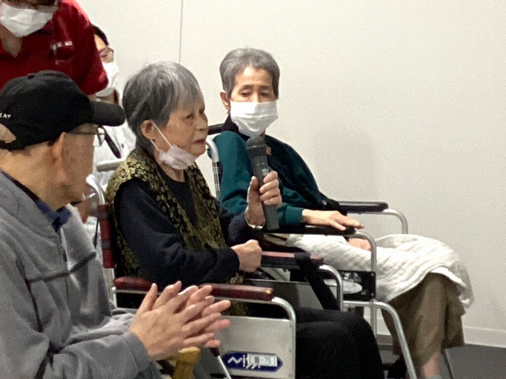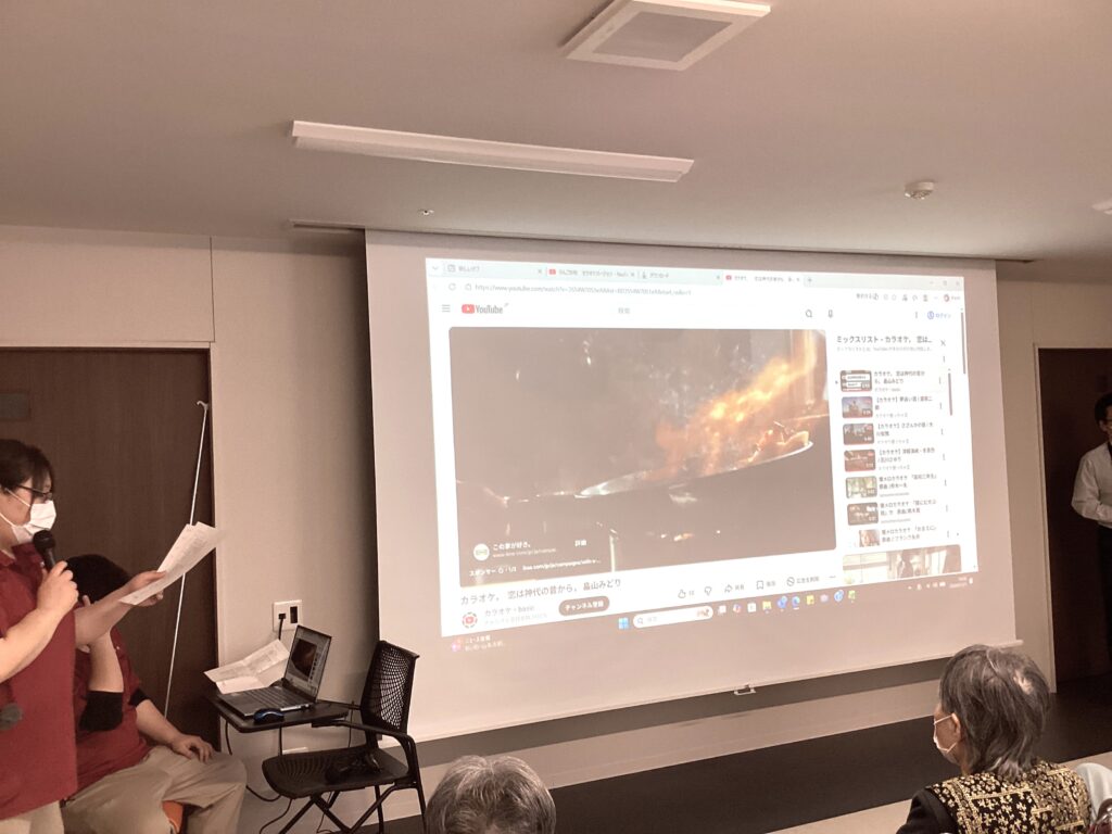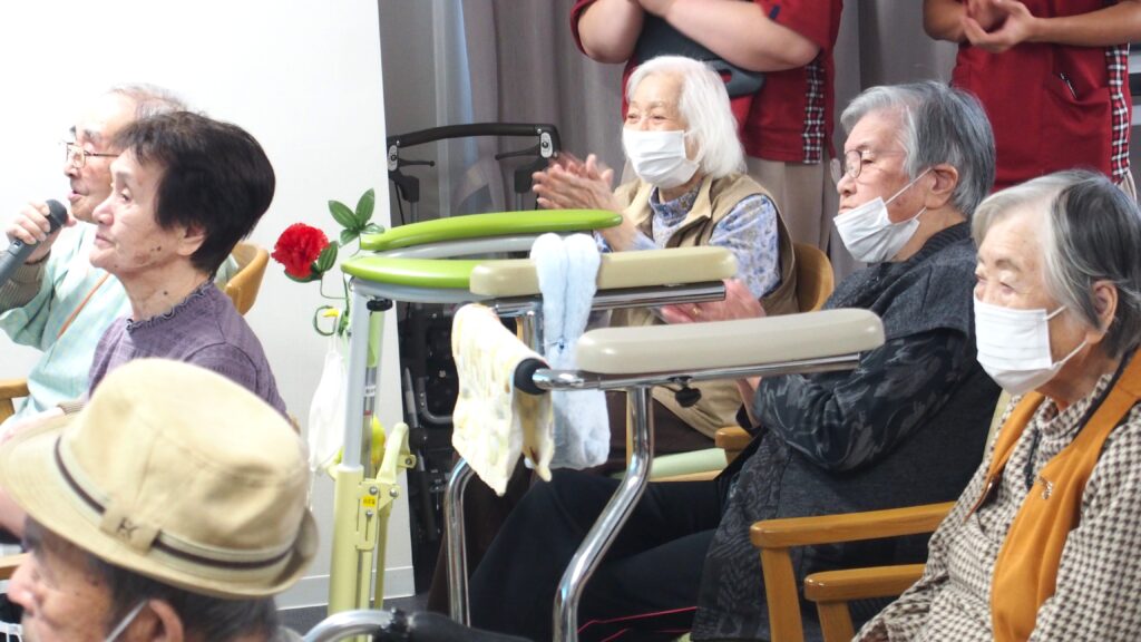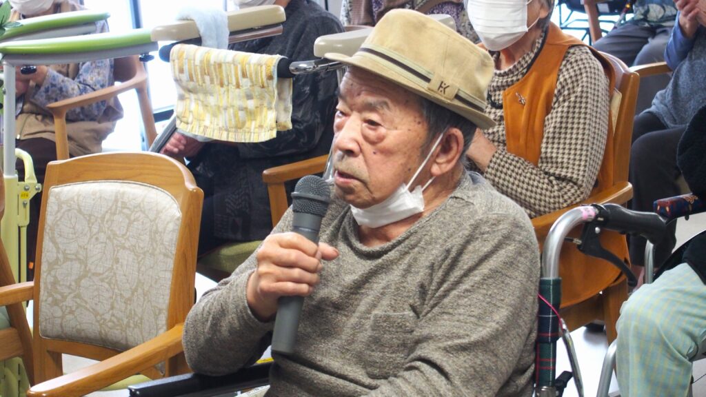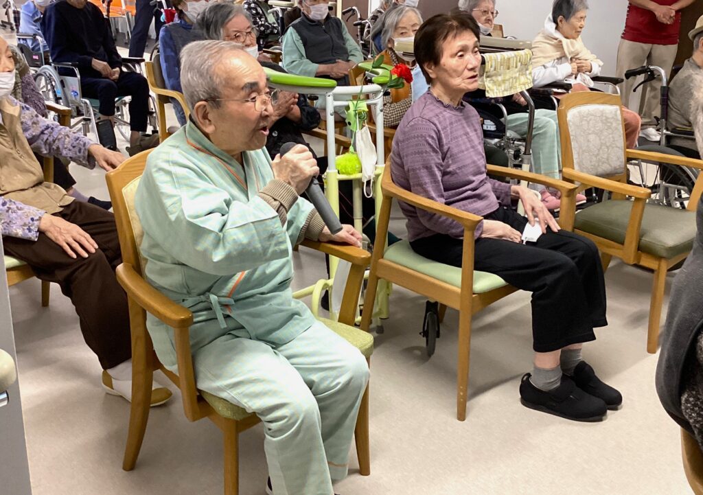 各階から27名の利用者様が集まり、10名の方がマイクを持って歌いました。