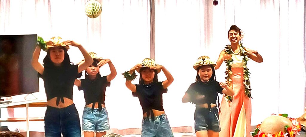小学生3名 中学生1名 大人6名による、色鮮やかな衣装とやさしハワイアンミュージックに包まれ、会場はまるで南国のような温かな空気に。