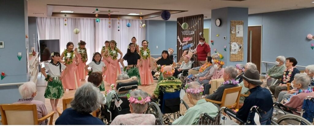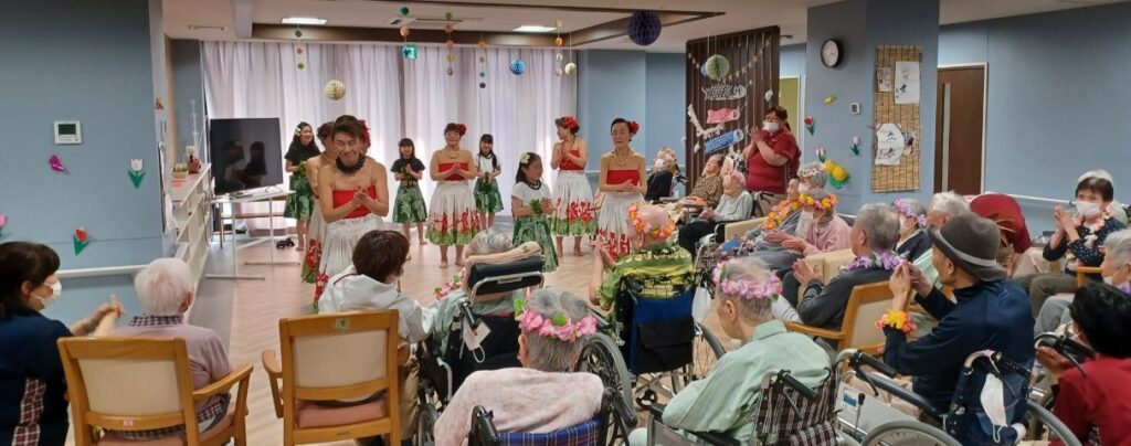 ご利用者様に笑顔と癒しの時間をお届けするために、【カ・ウル・リコ・カ・パライ田上教室様】にフラダンスのボランティア公演を行って頂きました。